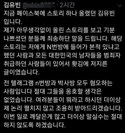 그는 "해당 스토리는 나에게 N번방에 들어가 본 적 있냐고 했던 사람과 모든 대한민국의 남자들을 범죄자 취급하던 사람들이 있어서 홧김에 저지른 글"이라고 해명했다. 그러면서 김유빈은 "나는 텔레그램 N번방과 박사방 모두 혐오하는 사람"이라며 "절대 그들을 옹호할 생각은 없었다. 여러분들이 뭐라고 하든 더 이상 내 논리 펼치지 않고 조용히 받아들이겠다. 이번 일로 깨달은 게 많고 더 이상 말실수하지 않겠다"며 재차 사과했다.