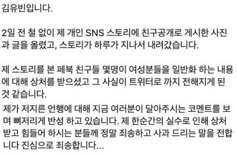 이 같은 글은 온라인을 통해 빠르게 퍼졌다. 논란이 커지자, 김유빈은 1차 사과문을 게재했다.