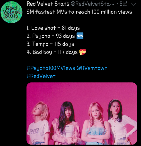 레드벨벳 사이코 sm 최단기록 2위로 뮤비 1억 달성