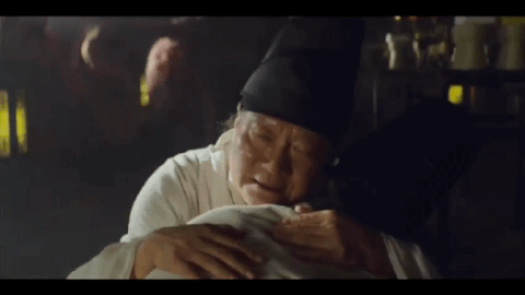 겁에 질린 어린 내관이 나이 든 내관에게 안김
