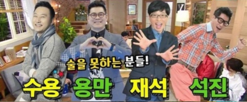 술을 못하는 개그맨 김수용, 김용만, 유재석, 지석진은 사모임 '조동아리' 멤버들
