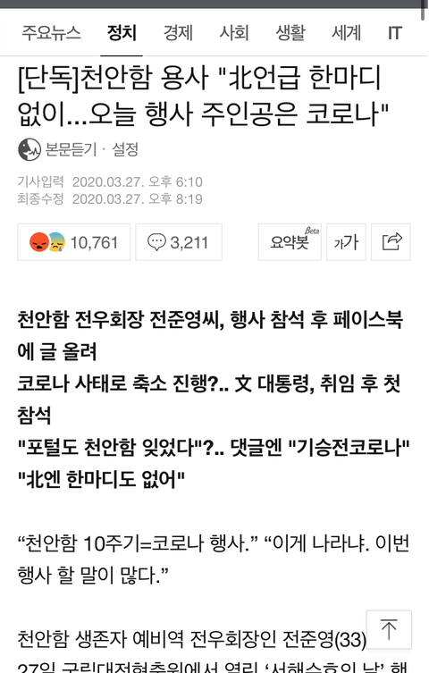 천안함 용사들이 말하길, 북 언급 한마디 없이 서해수호의 날 행사 “처음” 참석해서는 하는 말의 주제는 코로나였다고 함.