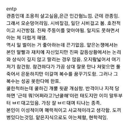 난 그런 테스트 완전 좋아해서 mbti 똑같은 거만 6번은 넘게 해본거같은데 다 엔프피 나왔아ㅋㅋㅋㅋㅋ 근데 엔프피 특징 읽어보면 반은 맞는데 반은 틀려 그래서 날 생각해보면 난 mbti 안믿을거같은데 오빠들이랑 개똑같어 걍 테스트 결과 그대로 빙의된줄 알았어 첫째 돼지ㅅㄲ는 estj 나왔은데 위계질서 ㅈㄴ 따지고 ㅈㄴ 꼰대임 공부는 개잘하는데 지도 알아서 ㅈㄴ 재수없음 그리고 ㅈㄴ 꽉막히고 융통성 밥말아서 쳐먹었어 둘째 멸치ㅅㄲ는 entp 나왔는데 진짜 그 아가리좀 쳐닫고싶어 걍 뇌 파보면 시비건다라는 생각밖에 없을거같아 아맞다 생각안하지 나랑 4살차이 나는데 나보다 말빨 ㅈㄴ 딸리면서 지는건 ㅈㄴ 싫어해서 아득바득 말로 이길려 하는데 볼때마다 안쓰럽고 한심하고 웃김ㅋㅋㅋㅋㅋㅋㅋ 그래도 위계질서 진짜 안따지고 꼰대짓 하나도 안해서 반말해도 뭐라 안하고 첫째보다 편하긴함 ... ㅋ ㅋ 여기서라도 뒷담까서 개시원하다 ㅎㅎㅎㅎㅎㅎㅎ