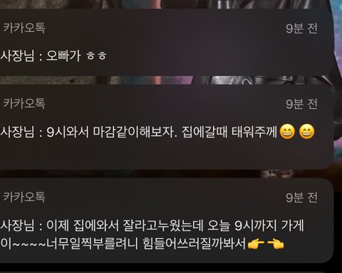 아니 오늘부터 일하게 됐는데 (오늘 첫 출근임) 사장새끼 ㅈㄴ 왜저러지;;; 후.. 전화로는 그냥 담백한 사장느낌인데 계속 카톡으러 저럼 일단 답장은 태워다준다는 거 무시하고 "그럼 9시에 뵐게요"라 보낸 후 마감하고 엄마가 이 근처로 일 하셔서 보고 가야한다하고 거절할 생각임. 아니 그건 그렇거 이가 도망가야되냐ㅠ 알바 좀 하다가 더 선 넘는 거 같으면 걍 잠수탈까