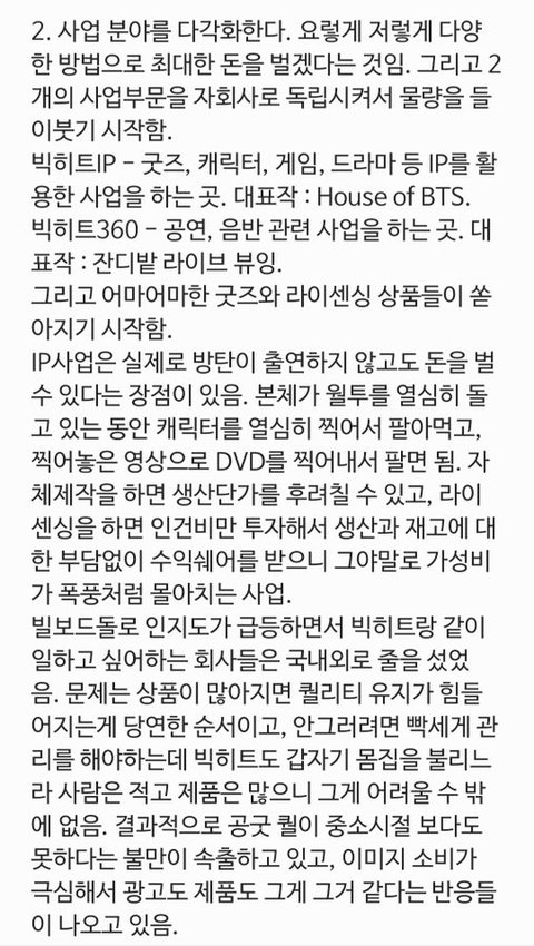 5. 빅히트의 상장 계획 2. 사업분야를 다각화. 그러나 상품이 감당 하지 못할 정도로 많아지면서 퀄리티가 하락했다는 말이 나옴