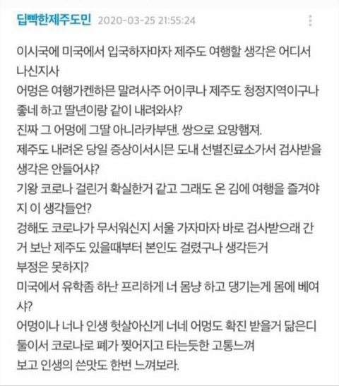 ˚✧₊⁎해석⁎⁺˳✧༚ 이시국에 미국에서 입국하자마자 제주도 여행할 생각은 어디서남?엄마는 여행간다하면 말려야지 어이쿠나 제주도 청정지역이구나 좋네 하고 딸년이랑 같이 내려옴?진짜 그 엄마에 그 딸 아니랄까봐. 쌍으로 잘하는짓이다. 제주도 내려온 당일 증상있었으면 도내 선별진료소가서 검사받을 생각은 안들었음?기왕 코로나 걸린거 확실한거같고 그래도 온김에 여행을 즐겨야지 이 생각 들었음?그래도 코로나가 무서웠는지 서울 가자마자 바로 검사받으러 간 거 보니까 제주도 있을때부터 본인도 걸렸구나 생각든거 부정은 못하지?미국에서 유학 좀 하니까 프리하게 너 마음대로 하고 다니는게 몸에 베였음?엄마나 너나 인생 헛살았네 너네 엄마도 확진받을거같은데 둘이서 코로나로 폐가 찢어지고 타는듯한 고통 느껴보고 인생의 쓴맛도 한번 느껴봐라