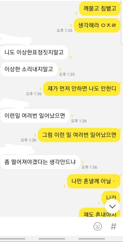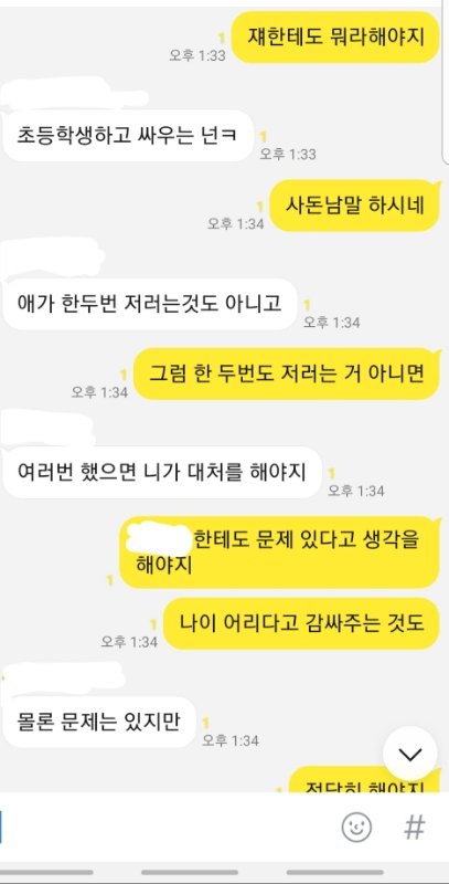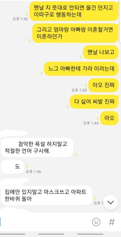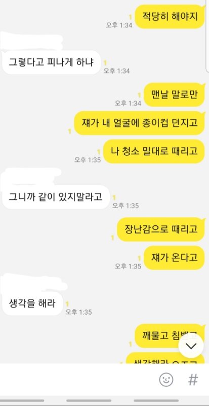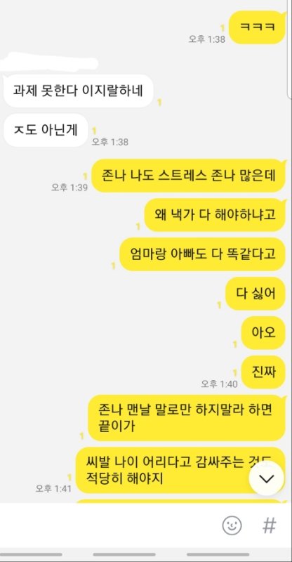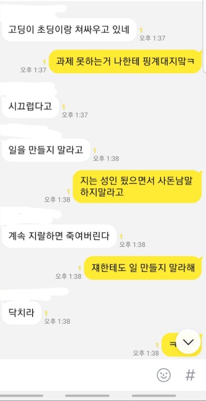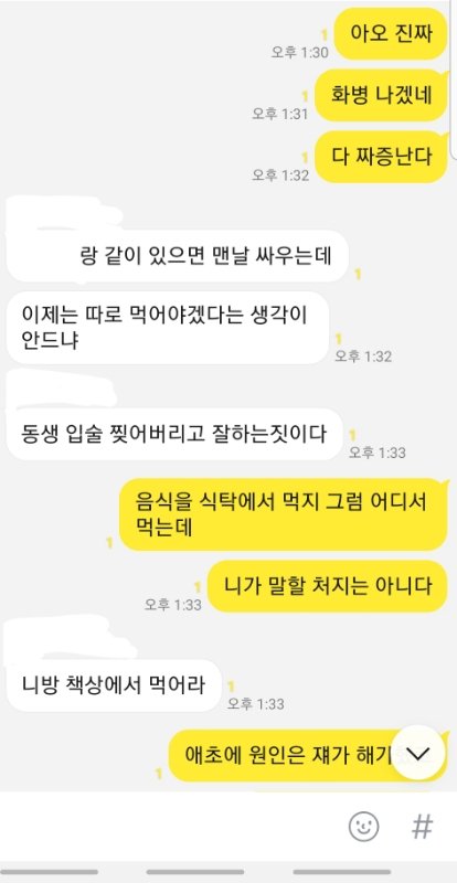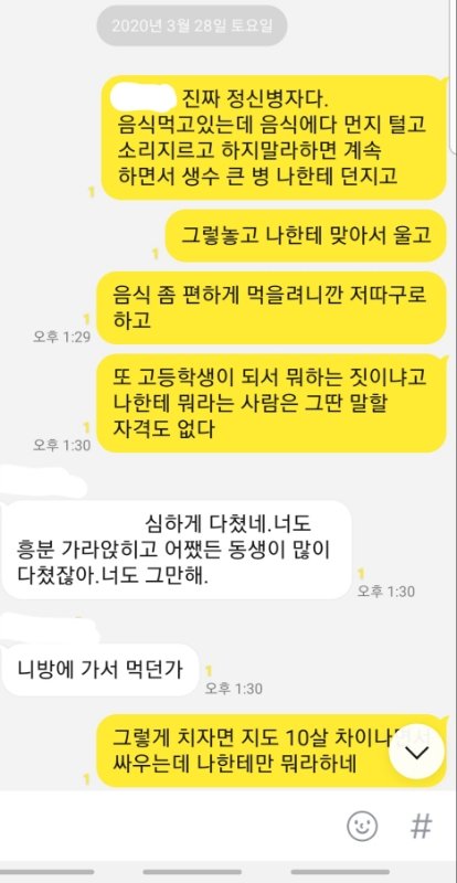 제가 라면 먹고 있는데 동생이 라면 한 입 달랬는데 제가 안줬다고 제 얼굴에 종이컵 던지고 라면에 입냄새 나게 하악하악 거려서 하지말랬는데 이상한 소리 내고 표정 지으면서 계속 하니깐 "니 음식에도 똑같이 할께" 라고 했는데 욕쓰면서 물 가득 들어있는 2L 생수 페트병 저한테 던지더군요. 그래서 제가 짜증나서 동생을 때렸는데 입술이 찢어졌더라고요. 근데 완전 지 곧 있으면 죽을듯이 울면서 너무 아프다고 과민반응 하는데 진짜 내면에서 충돌 일어났습니다. 잠시 후 제 친오빠 20살짜리가 소리지르면서 시끄럽다고 동생 입술 찢어진 거 보고 엄마한테 사진 찍어서 보내준 뒤 저보고 "고등학생이 되가지고 초딩이랑 싸우고 있어"라는 둥 저한테 설교를 하는데 개빡쳐서 저희 가족 단톡방에 톡을 보냈습니다.