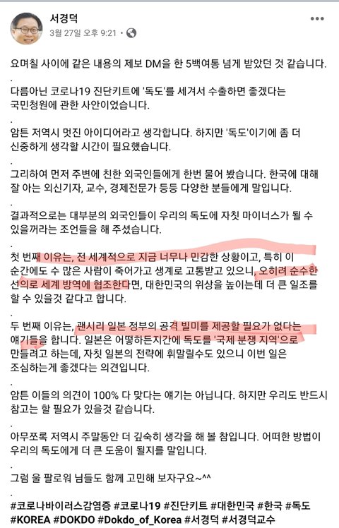 서경덕 교수가 페북에 올린 글을 봤는데 나도 어느정도 동의함. 신중해야될 문제가 아닐까 진단키트가 좋은거 진단하는것도 아니고 병 진단하는건데 독도에 대한 이미지가 알게모르게 안좋아질 수도 있잖아