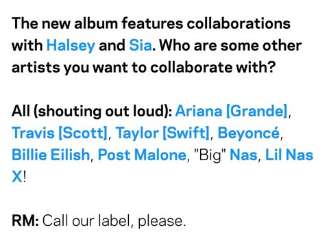 BTS: 이라아나! 트래비스캇! 테일러! 비욘세 ! 빌리아일리시! 포스트말론 ! 나스! 릴나스엑스!