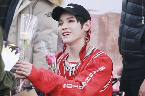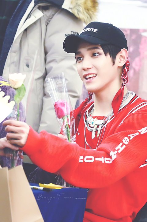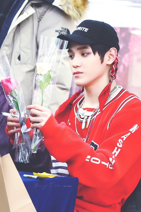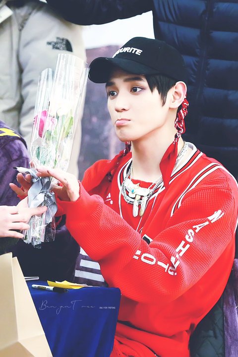 팬이 태용이한테 장미 두송이 선물로 줬는데