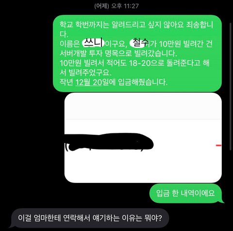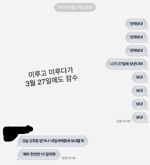 저는 화가 났지만 기다려주자 라는 생각으로 27일까지 기다리게 되었고, 27일-28일 사이에 갚겠다고 카톡이 왔습니다.