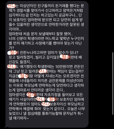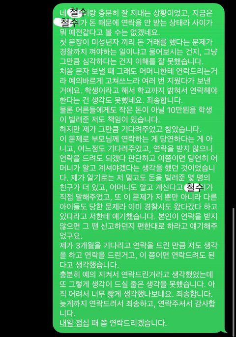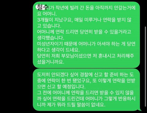 신고를 하기에는 적은 돈이지만 쓰니 부모님께 말씀드려 정말 민사소송을 해볼까 하는 생각을 하였으나, 연락이 되어 조금만 더 기다려주자 라는 생각을 하였습니다.