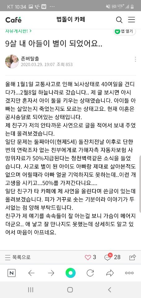 그런데 첫째 아이의 교통사고사망합의금이 친부의 생존으로인해 50%로가 지급된다네요.. 진짜어이없죠..