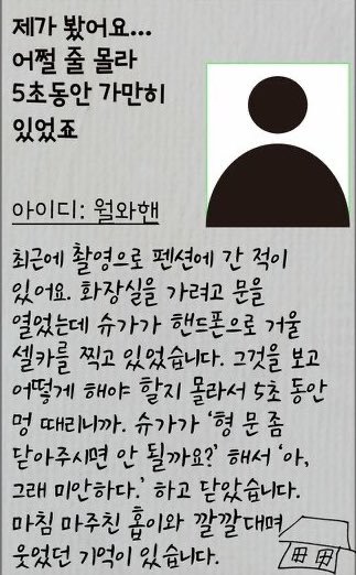 꿀에펨 생각남 ㅋㅋㅋㅋㅋㅋㅋㅋ 안무 연습 할때마다인가 긴장해서 자꾸 화장실 간다고 하던 멤들 ㅋㅋㅋㅋㅋㅋ 그리고 펜션에 촬영가서 스찌가 화장실 문 열었는데 거울 셀카 찍고 있는 윤기를 발견하고 5초 정적 이었는데 "형 문 좀 닫아주시면 안될까요" 하던 윤기랑 ㅋㅋㅋㅋㅋㅋㅋ 방송국에서 화장실 아무 목소리도 안들렸는데 온 공기가 슈가형이라 "슈가형..?"이라고 호석이가 혹시나 해서 물었더니 진짜 였던 썰 ㅋㅋㅋㅋㅋㅋㅋ