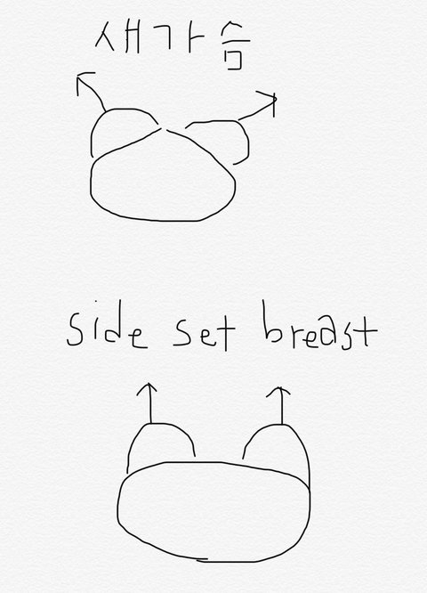 side set breasts: 보통 손가락 세개이상만큼 떨어져있음. 세로절개가 들어간 발코니 브라나 고어가 넓고 사이드패널이 있는 브라 추천. 골이 생기길 원한다면 고어가 낮은 플런지브라를 입어도 됨-별로 편하지는 않지만 골은 생김.