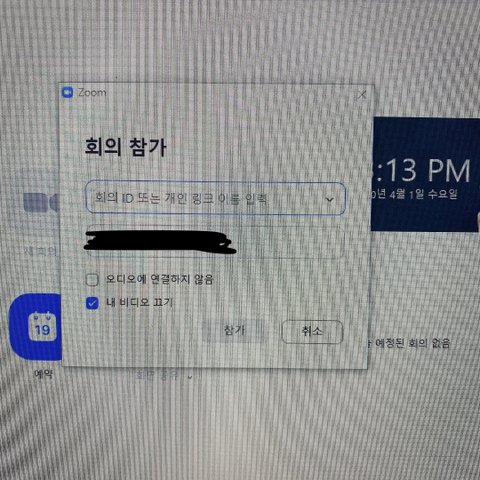 이런창이떠 가린건 내이름이야! 저기 회의ID라고 되어있는곳에 쌤이나 학교에서 보내주는 아이디를 입력하고 참가를 누르면돼 저 밑에 있는 오디오에 머시기랑,내 비디오 끄기는 딱히 신경안써도돼! 어차피 회의참가해서도 설정바꿀수있어!!