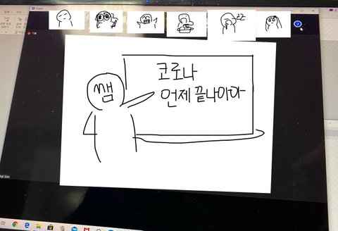 이런식으로 말하는사람(쌤)화면이 크게나오고 위에 작게 너랑 너친구들(수업듣는학생들) 화면이 나와 슬프지만 다 볼수있어..ㅠ 그리고 말하면 저 쌤 화면이 작아지고 니화면이 커지고 ㅇㅋ?