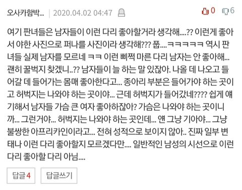 잘들 싸우네^^ 내 허벅지가 어떻건 평가하라고는 안했는데? 누가봐도 할짓없는 뚱땡이 아저씨들 와서 남자들은 안좋아한다 ㅇㅈㄹ