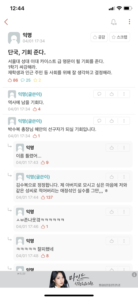 막상 단국대는 아무렇지도 않은데 댓글에서 이대는 왜? 이러는거 개웃김 아니 눈치좀ㅋㅋㅋㅋㅋㅋㅋ...