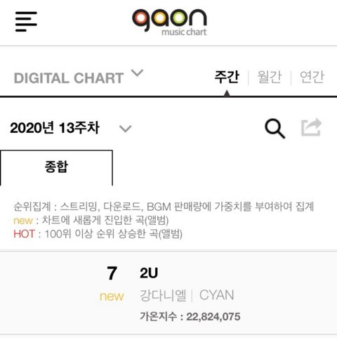 13주차 디지털차트에 랭크된 신곡 7위 강다니엘 ‘2U’