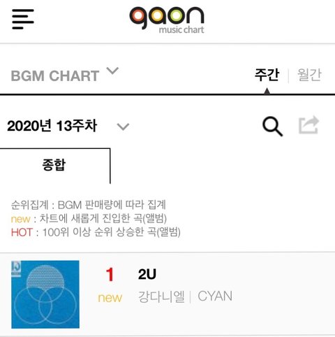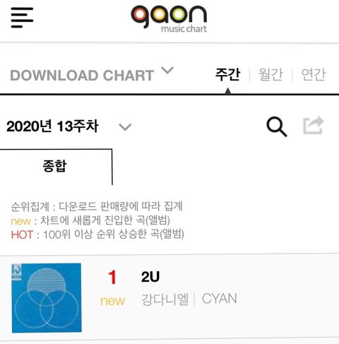 가온차트를 운영하는 사단법인 한국음악콘텐츠협회는 “강다니엘의 새 앨범 ‘CYAN’이 앨범차트에서 1위, 타이틀곡 ‘2U’는 다운로드차트, BGM차트에서 1위에 랭크되어 3관왕의 영예를 안았다.”고 발표했다.