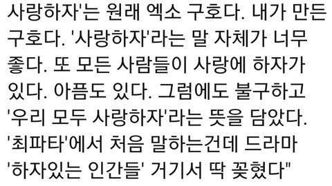 난 단순히 우리 구호 사랑하자! 그 뜻만 생각하고 있었는데 "사랑, 그리고 하자".... 하자가 그 하자있다할때 그 이중적인 뜻도 있다해서 어제 엄청 놀랐어 어제부터 계속 그 뜻을 곱씹어 보게 된다