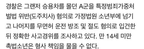 운전자는 2006년 11월생으로 또 촉법소년이라고 처벌을 안 받을지도 모릅니다. 촉법소년이라는 법이 아직은 미성숙한 아이들이 잘못된 판단을 할 수 있기에 전과기록을 남기는 등의 미래에 영향을 끼칠 수 있는 처분을 받지 않는 것인데 어떻게 사람을 죽이고 도망친 저 아이들이 미성숙하다고 생각할 수 있는 건가요?