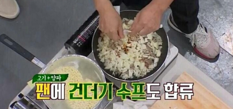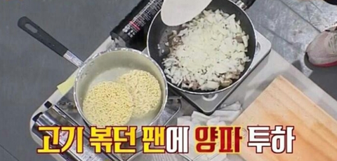 고기와 양파를 볶던 팬에 짜장라면 건더기 스프도 넣음