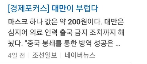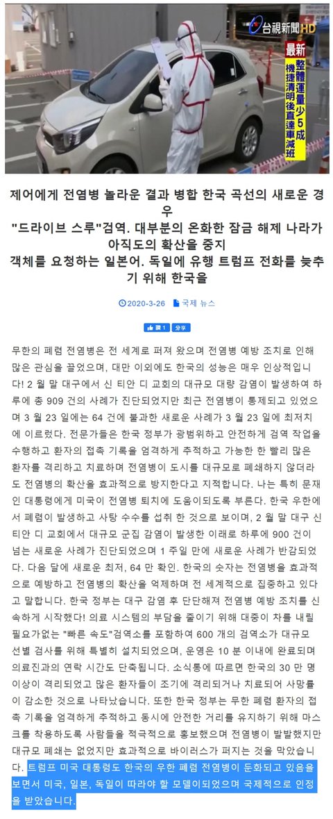 그러나 정작 대만 뉴스에서는 한국의 바이러스 대처를 본받아야 한다는 기사 나옴.