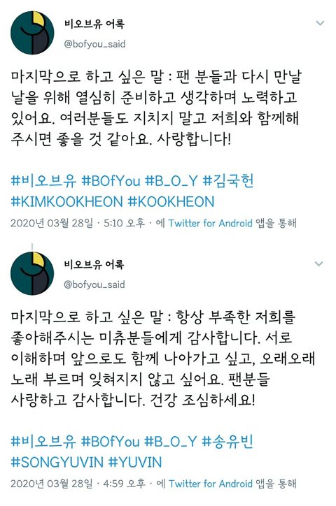 + 비오브유는 멤버가 김국헌 송유빈 둘인데 신기하게도 MBTI 검사 결과 겹치는게 하나도 없다. (김국헌은 ISTJ 송유빈은 ENFP)