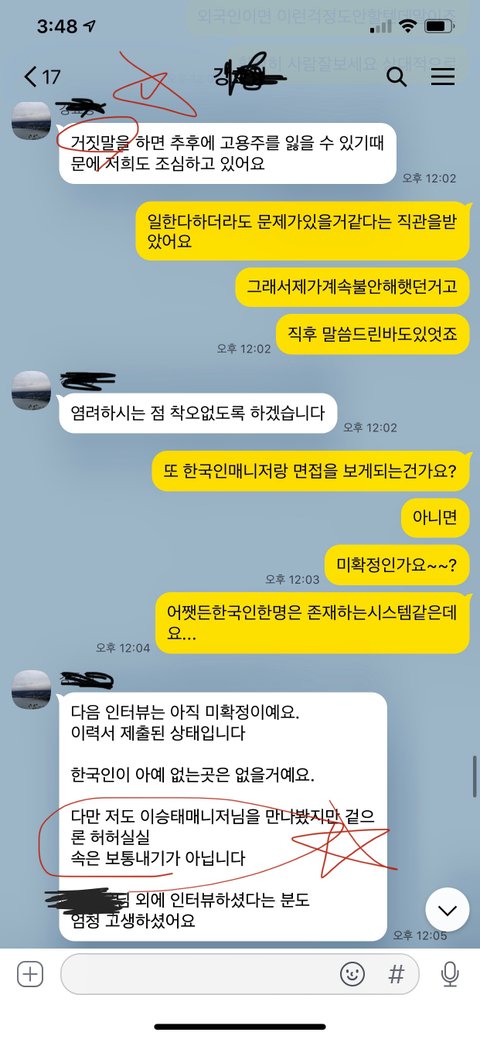 : 고용주에게 사기를 치라고 계속 협박하는 카톡. 지들이 내돈들고있으니까그지같이 행동하는거임, 내가 인터뷰 떨어지니까 그에해당하는 매니저에게 앙심품은모습ㅋ