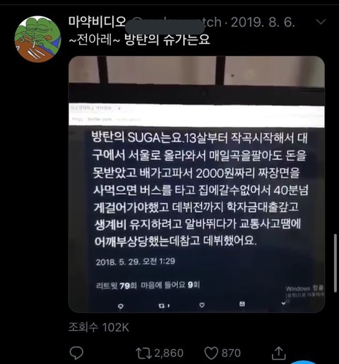 저거 방탄의 슈가는요가 뭐냐면 어떤팬이 사진처럼 댓글 쓴건데 그거보고 웃겨서 어떤 사람이 그걸 노래 처럼 불러서 이슈 됨 그걸 따라한거임 솔직히 저 트윗 웃긴거 맞잖아 ㅋㅋㅋㅋㅋ