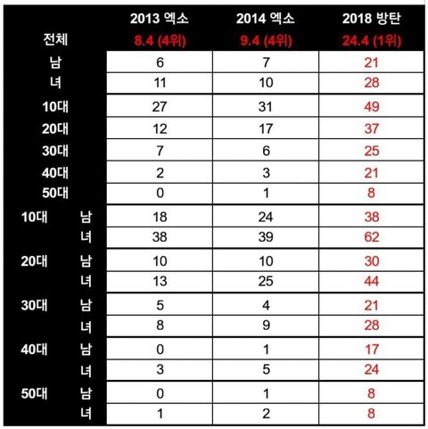 - 으르렁때 엑소 갤럽은 방탄의 1/3수준