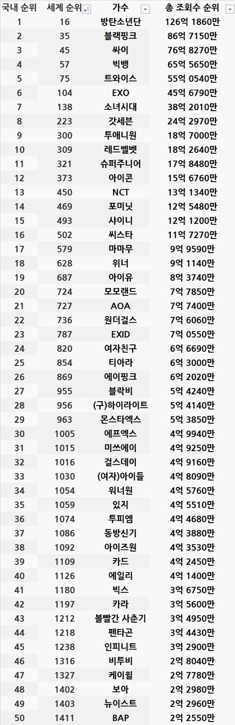 그사이에 방탄소년단과 블랙핑크가 엄청 치고 올라왔네요