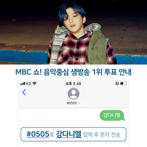 MBC 쇼! 음악중심 생방송 1위 투표 안내 투표 방법 - #0505로 ‘강다니엘’ 입력 후 문자 전송 다니티 ㅎㅇㅌㅎㅇㅌ❤❤❤