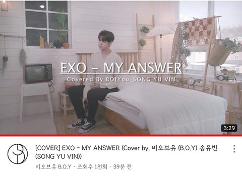 토요일에 일하는 뮤웍 보니까 너무나도 어색하닷.. 하지만 뮤웍 칭찬해☆ 유빈이 커버 올라와따 으아아아아아 월요일에 영상 안올라와서 화난거 한 40%쯤 풀림 ^^ 엑소님들 My Answer이라는 노래 커버한 유빈이! 사실 이노래는 처음 들어본거라 유빈이 버전 듣고 이제 원곡도 들어보려고 ㅎㅎㅎㅎ 그리고 역시 다 좋지만 쓰니는 본업하는 유빈이가 제일 좋다 커버영상 자주 올려줬으면 ㅜㅜ