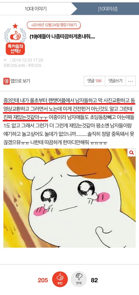 2016년 12월이니까 3년 반정도 된 글인데요. 저때만 해도 랜덤채팅으로 음란채팅하거나 몸사진 영상을 남한테 보내는 행동에 대해서 경각심이 너무 없는게 충격적이네요.