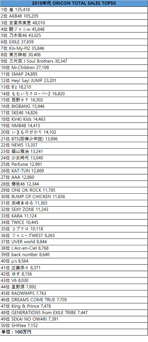 2010년대 오리콘 CD+DVD+블루레이 통합 매출 순위