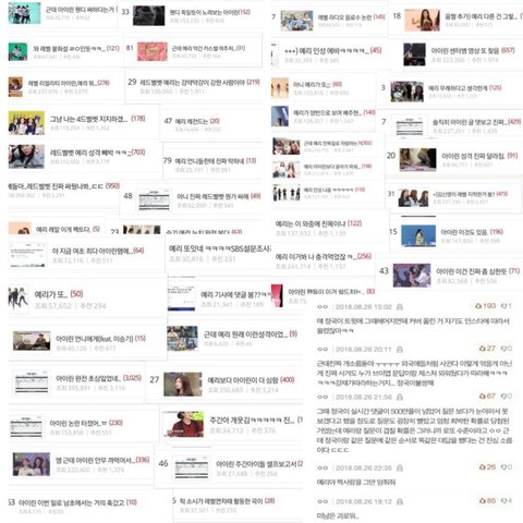 2018년 제일 많이 본 문장이 예리가 또 인거 알아? 아직도 판 검색에 예리 멤버 라고 치면 까글 수두룩 나와 저사진 지금 일부분만 캡쳐해서 온건데도 저렇게 많아 제발 저기에 동조했던 애들은 한번 봐봐 너네가 뭘 했는지