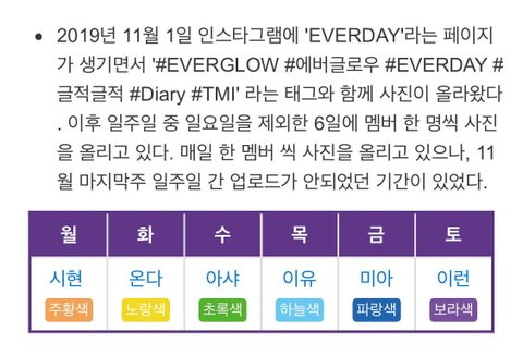 에버글로우 멤버별 색하고 대표 요일인데 빨강색하고 일요일만 비워 놓음