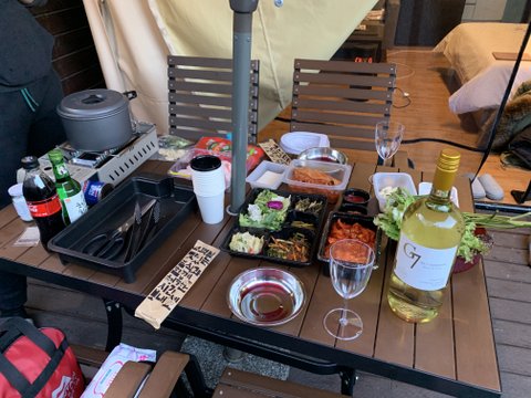 반찬들이랑 고기챙겨서 가까운데로 글램핑다녀왔어요.