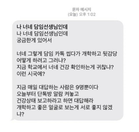 선생님도 화 많이 참으면서 말씀하시는게 보인다 vs 말투 너무 거칠다 대충 이렇게 나뉘는 것 같은데 너넨 어떰? 난 저기 저 '뒷감당 어떻게 하려고 그러냐' 이 부분만 빼면 ㄱㅊ은듯.. 뒷감당이 코로나 말하는게 아니라 본인이 개학하고 나서 보복하겠다 뭐 그런 식으로 들려서 너무 별로임