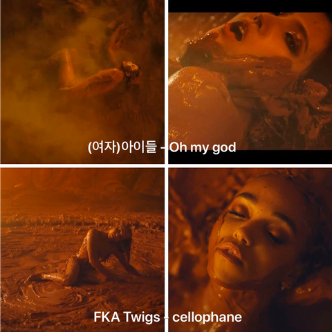 cellophane에서는 추락한 FKA Twigs의 몸에 진흙을 바르는 '타인들'이 있다는 게 그나마 다른 설정이지만, 이건 솔직히 아무리 생각해도 동일한 이미지가 맞다고 생각함.