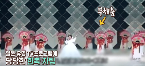 한복을 입고 뒤에는 부채춤을 추는 댄서들과 노래를 부르는 모습