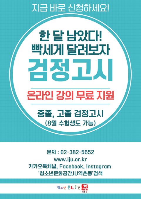 14-24세 검정고시 무료 인강, 온라인강의 지원!! 청소년문화공간JU역촌동(수업료전액지원)