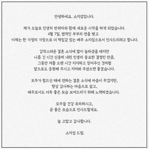 "소지섭이 소중한 인연을 만나 백년가약을 맺었다"며