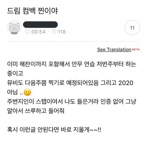 근데 나도 2020은 아니고 드림 뭐 있는건 찐이라고 몇군데서 들었는데 진짜 컴백인가? 아님 슴스테..?? 뭐가됐든 드림이들 보고싶어ㅠㅠ