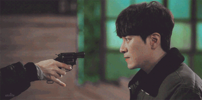 권총을 쳐내면서 끔찍한 회상에서 돌아오는 남주