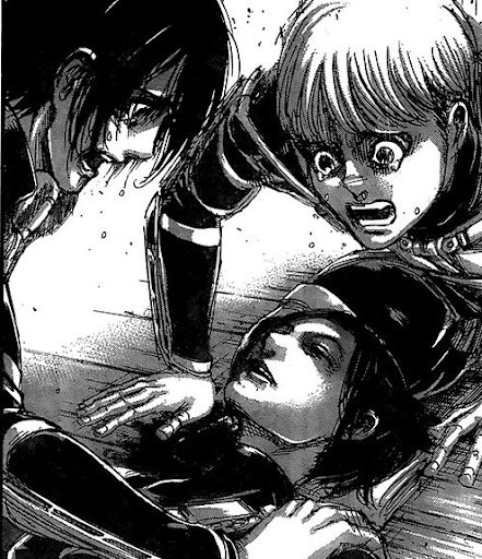 이 과정에서 에렌이 전퇴의 거인을 계승하지만 사샤가 마레 전사대원 가비 브라운이 쏜 총을 맞고 죽게됨.