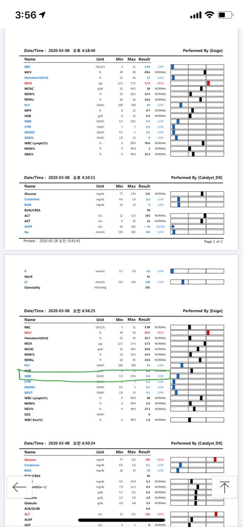 로나는 검사당시 이미 백혈구 수치가 거의 제로에 가까워서 잠복기가 길었던것 같다는 소견을 받았고
